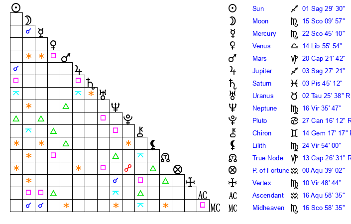 | Venus | 14 Libra 55 | 22 Scorpio 17 | 0 Aquarius 39 |