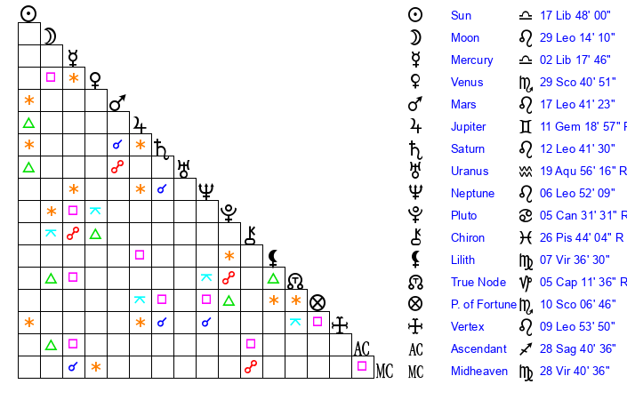 | Moon | 29 Leo 15 | 21 Gemini 40 | 13 Leo 18 |