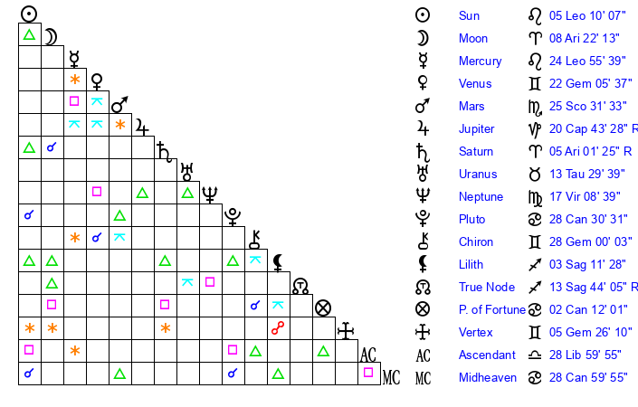 | Sun | 5 Leo 10 | 5 Leo 52 | 0 Scorpio 52 |