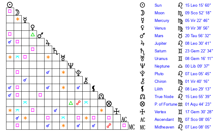 | Sun | 15 Leo 16 | 16 Leo 24 | 5 Scorpio 24 |