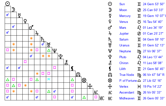 | Moon | 25 Cancer 54 | 29 Aquarius 19 | 10 Leo 5 |