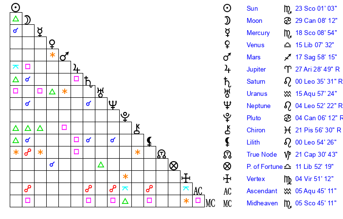 | Sun | 23 Scorpio 1 | 23 Scorpio 49 | 12 Pisces 33 |