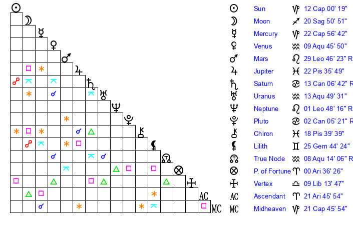 | Moon | 20 Sagittarius 57 | 0 Pisces 52 | 18 Sagittarius 9 |