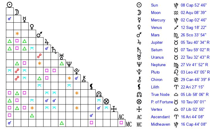| Mars | 26 Scorpio 34 | 11 Capricorn 42 | 24 Capricorn 37 |