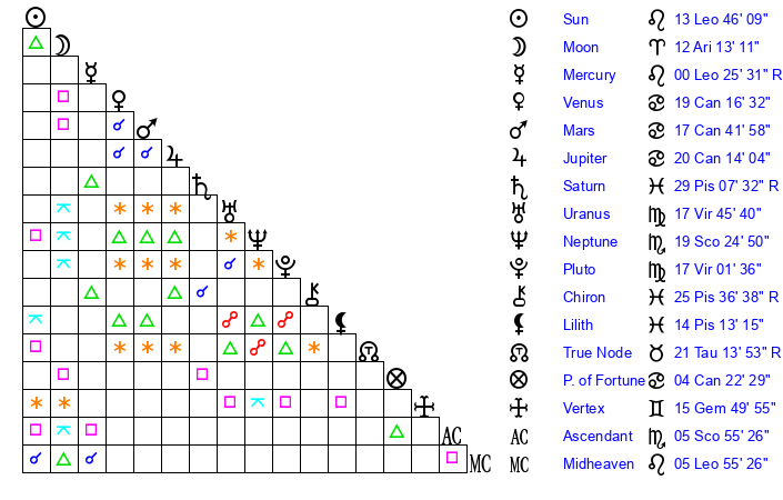 Sun | 13 Leo 46 | 14 Leo 29 | 11 Libra 1 |