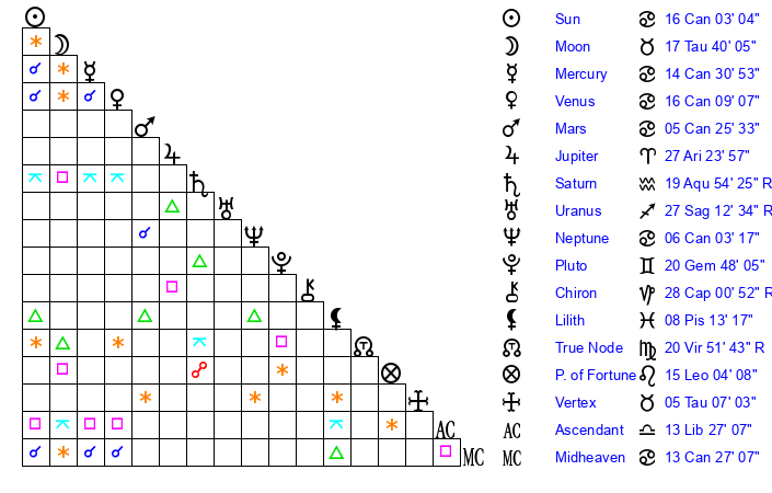 | Sun | 16 Cancer 3 | 16 Cancer 47 | 13 Scorpio 52 |
