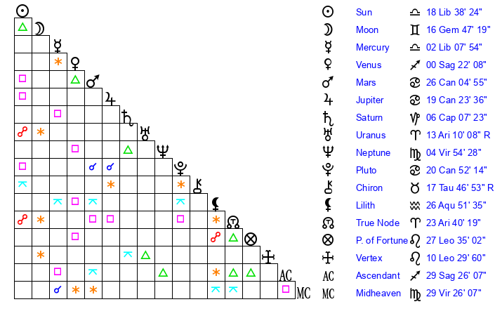 | Moon | 16 Gemini 42 | 5 Cancer 58 | 19 Sagittarius 19 |