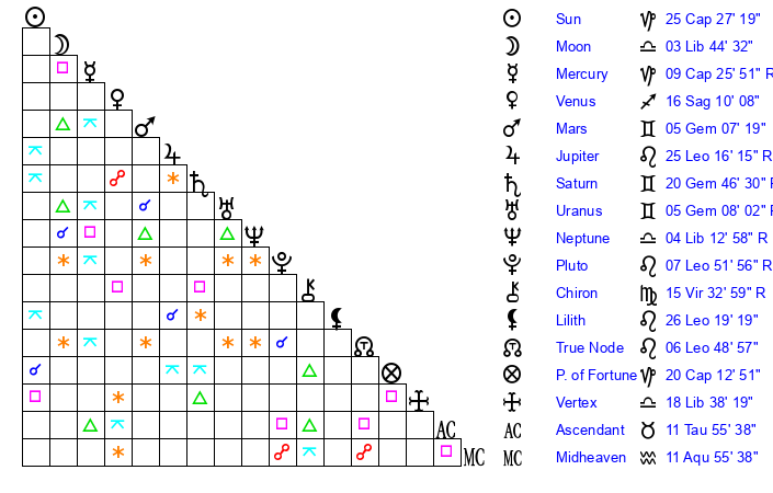 | Neptune | 4 Libra 14 | 27 Pisces 34 | 2 Libra 30 |