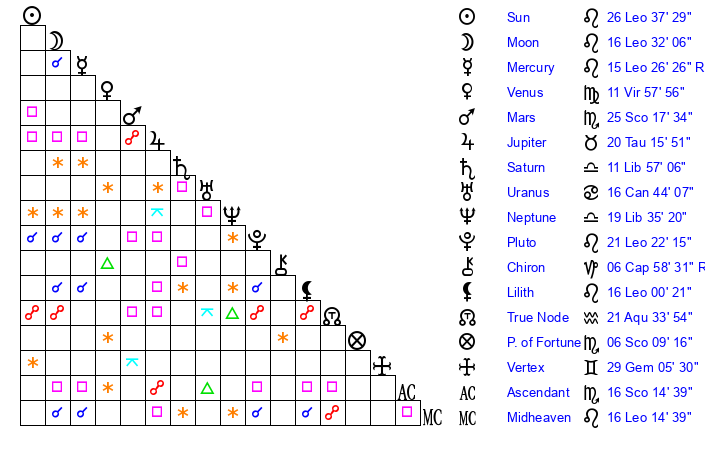 | Moon | 16 Leo 34 | 12 Cancer 33 | 21 Aries 46 |