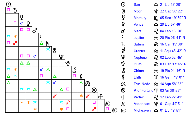 | Moon | 22 Capricorn 52 | 16 Leo 31 | 29 Capricorn 24 |