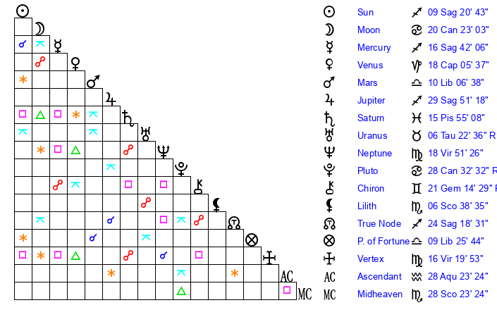| Moon | 20 Cancer 18 | 23 Aries 53 | 18 Libra 42 |