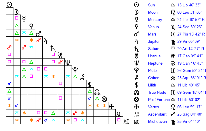 | Sun | 13 Libra 47 | 14 Libra 41 | 10 Aquarius 58 |