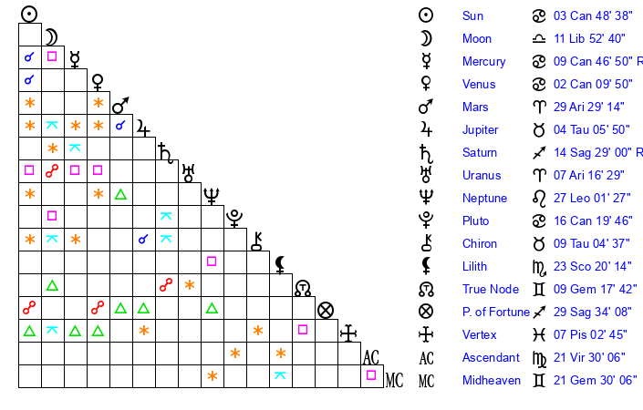 | Moon | 12 Libra 3 | 7 Cancer 25 | 22 Aries 29 |
