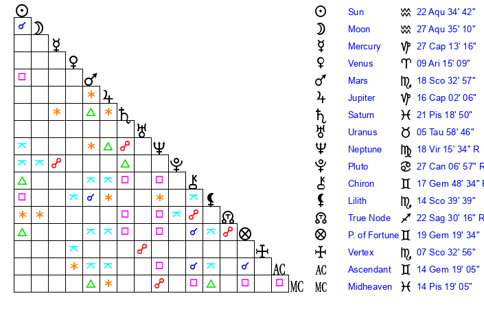 | Sun | 22 Aquarius 34 | 23 Aquarius 13 | 19 Taurus 36 |