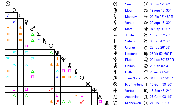 | Sun | 5 Pisces 42 | 6 Pisces 20 | 28 Taurus 18 |