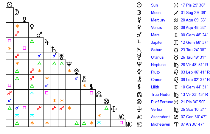 | Sun | 17 Pisces 30 | 18 Pisces 22 | 8 Gemini 38 |