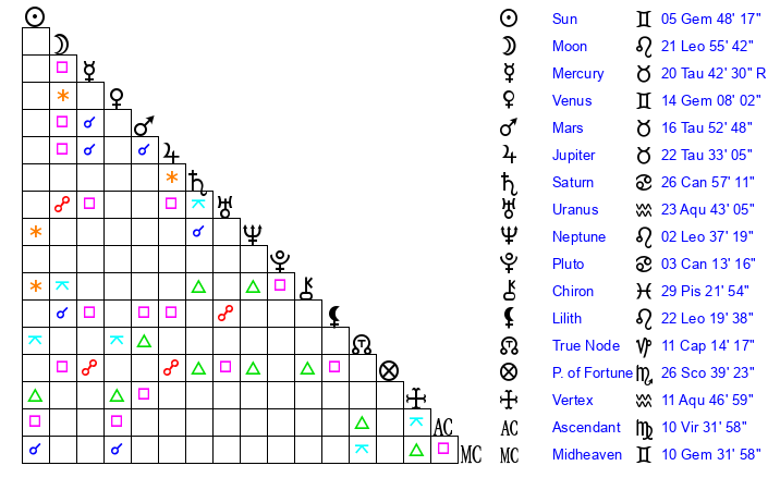 | Moon | 21 Leo 51 | 14 Gemini 53 | 8 Leo 47 |