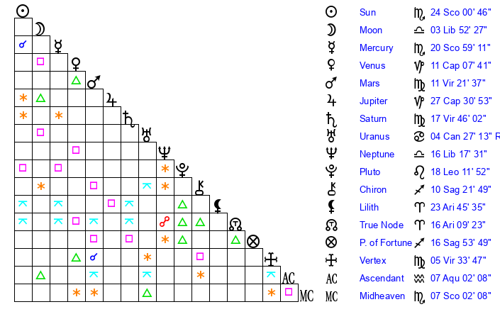 | Sun | 24 Scorpio 1 | 24 Scorpio 35 | 11 Aquarius 16 |