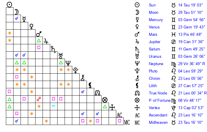 | Sun | 14 Taurus 19 | 15 Taurus 27 | 2 Leo 49 |