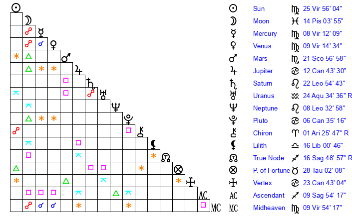 | Sun | 25 Virgo 55 | 27 Virgo 0 | 13 Capricorn 18 |