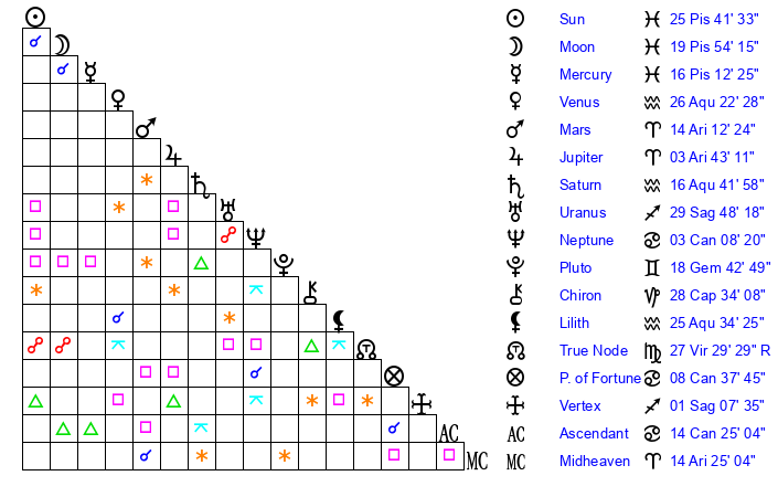 | Sun | 25 Pisces 41 | 26 Pisces 21 | 22 Cancer 44 |