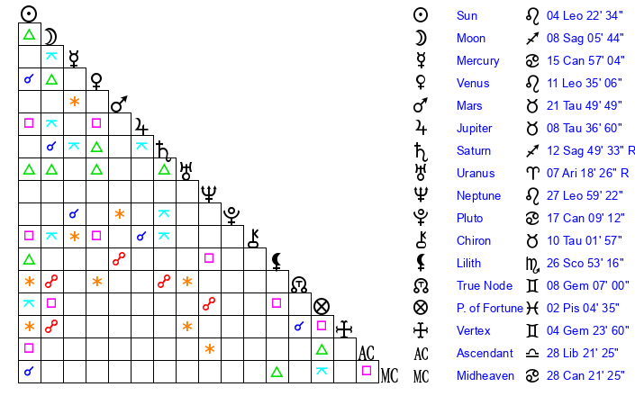 | Sun | 4 Leo 22 | 4 Leo 55 | 9 Scorpio 2 |