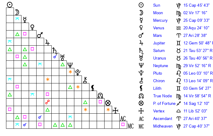 | Moon | 2 Virgo 18 | 12 Aries 52 | 15 Virgo 51 |
