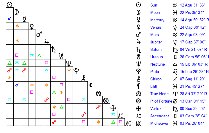 | Sun | 12 Aquarius 32 | 13 Aquarius 5 | 28 Aries 19 |