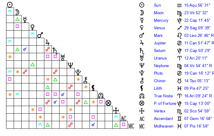 | Pluto | 19 Cancer 16 | 2 Aquarius 12 | 18 Cancer 59 |