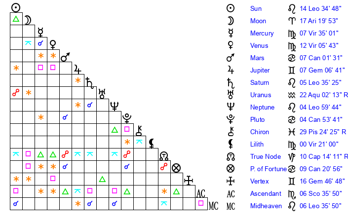 | Neptune | 5 Leo 0 | 1 Aries 52 | 7 Leo 3 |