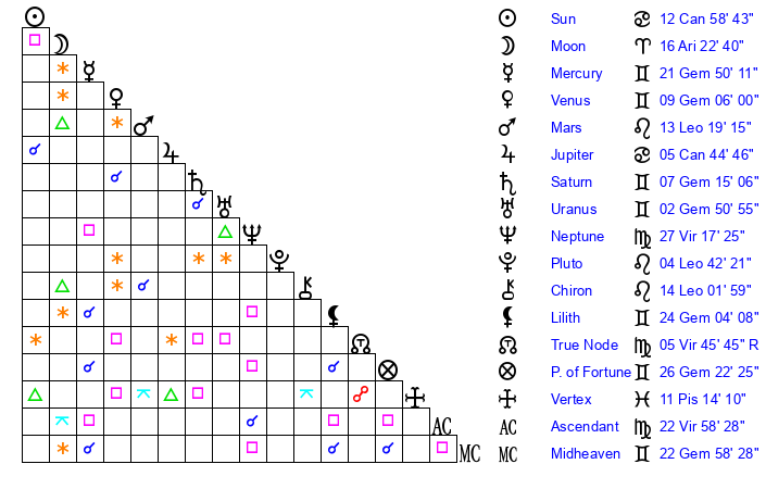 | Saturn | 7 Gemini 30 | 1 Aries 46 | 12 Gemini 48 |