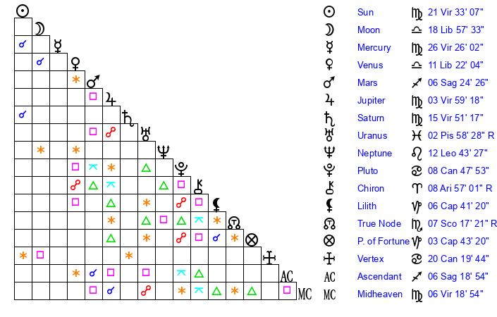 | Saturn | 16 Virgo 29 | 28 Pisces 53 | 25 Virgo 27 |