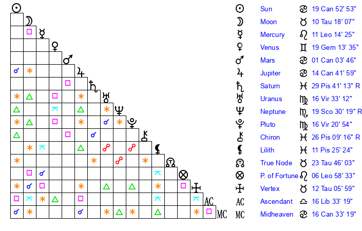 Moon | 10 Taurus 10 | 12 Aquarius 59 | 6 Cancer 24 |