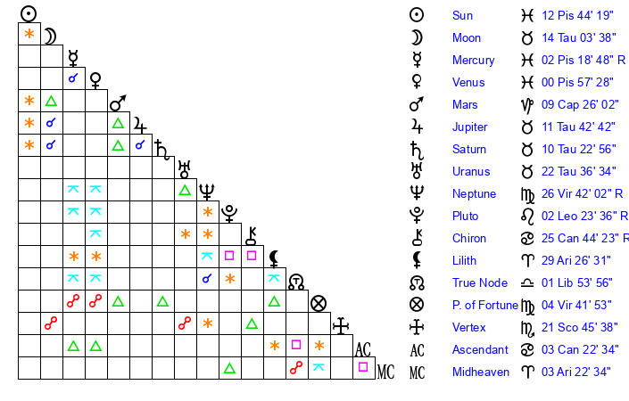 | Sun | 12 Pisces 44 | 13 Pisces 22 | 5 Gemini 2 |