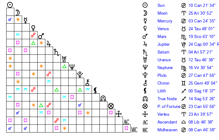 | Moon | 25 Aries 25 | 9 Libra 59 | 24 Cancer 0 |