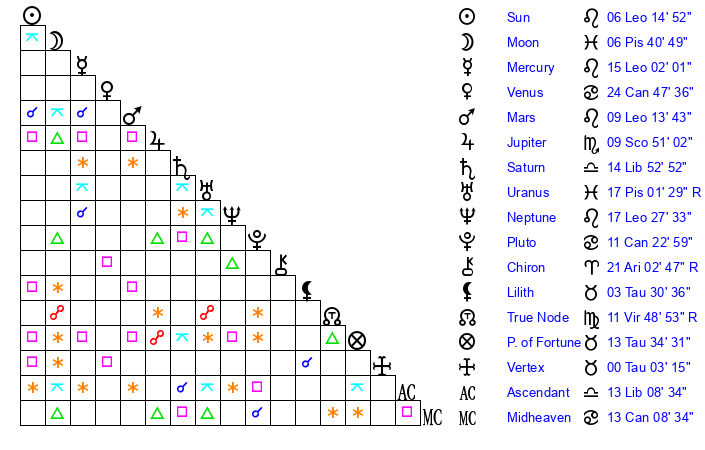 | Neptune | 17 Leo 42 | 27 Pisces 18 | 15 Leo 25 |