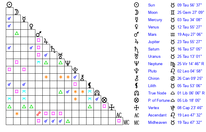 | Saturn | 17 Taurus 8 | 27 Pisces 44 | 26 Taurus 43 |