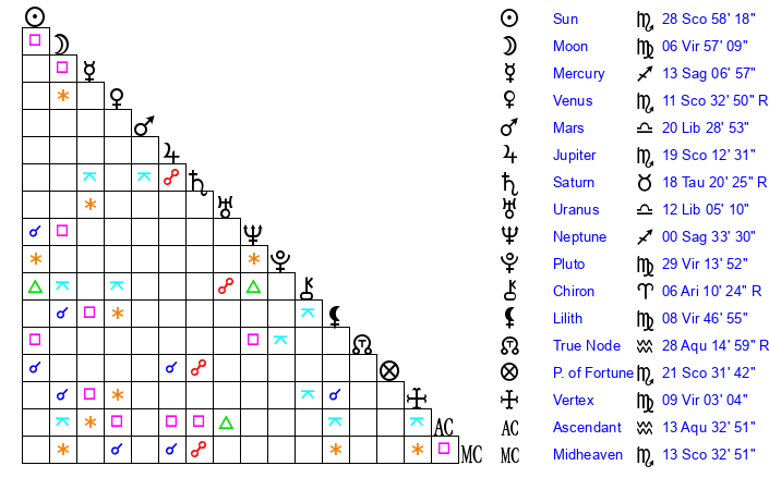 Jupiter | 19 Scorpio 6 | 18 Gemini 23 | 29 Scorpio 56 |