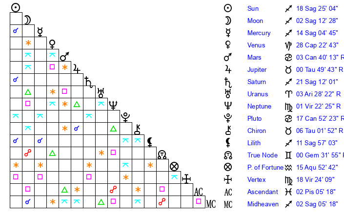 | Saturn | 13 Sagittarius 56 | 14 Pisces 31 | 19 Sagittarius 26 |
