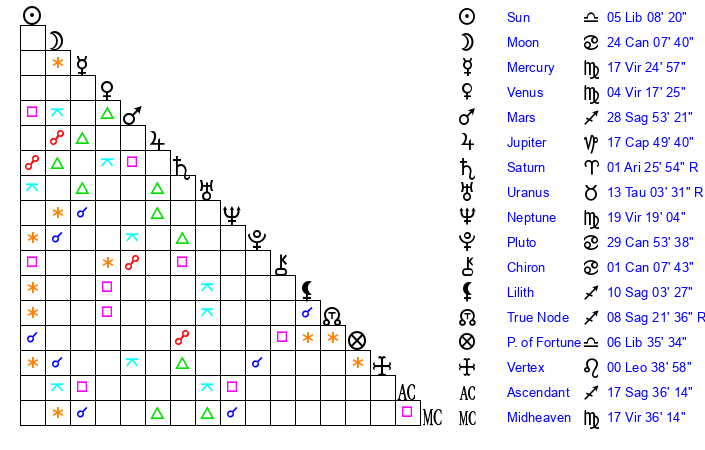 | Moon | 24 Cancer 0 | 21 Sagittarius 31 | 16 Libra 22 |