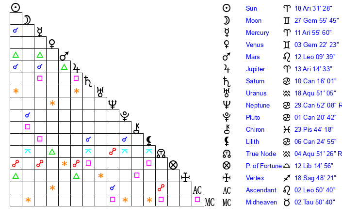 | Sun | 18 Aries 31 | 19 Aries 6 | 3 Leo 19 |