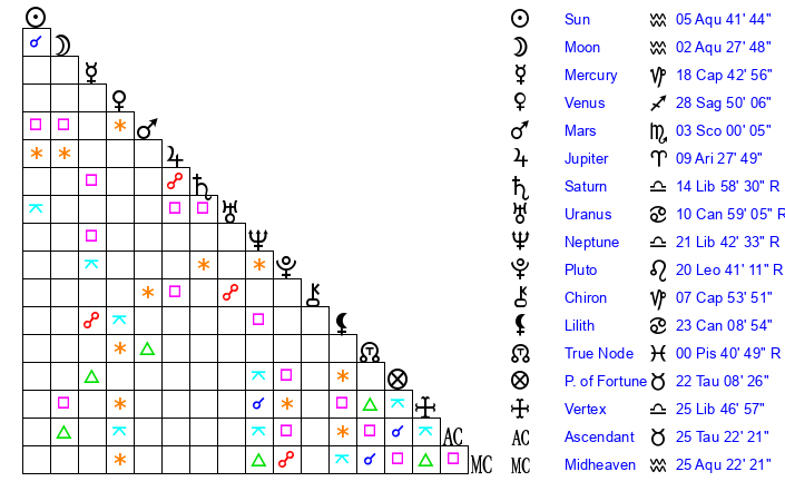| Sun | 5 Aquarius 42 | 7 Aquarius 0 | 18 Aries 48 |