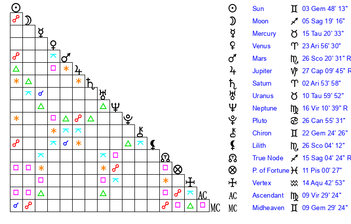 | Sun | 3 Gemini 48 | 4 Gemini 30 | 27 Leo 57 |