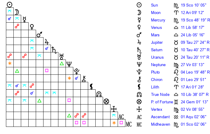 | Sun | 19 Scorpio 10 | 19 Scorpio 33 | 15 Aquarius 31 |