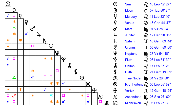 | Moon | 7 Taurus 57 | 5 Sagittarius 27 | 19 Taurus 31 |
