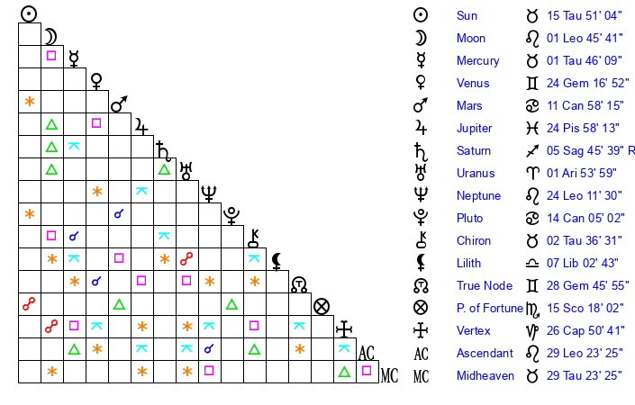 | Sun | 15 Taurus 51 | 17 Taurus 6 | 19 Leo 39 |