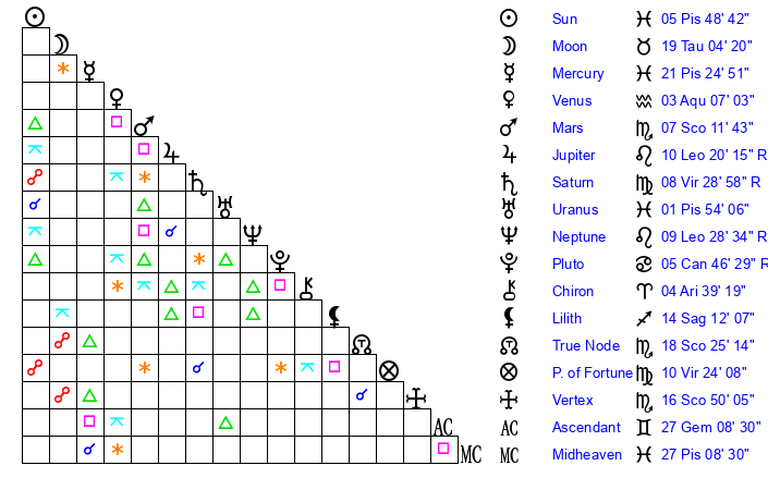 | Moon | 19 Taurus 8 | 6 Aquarius 26 | 17 Pisces 21 |