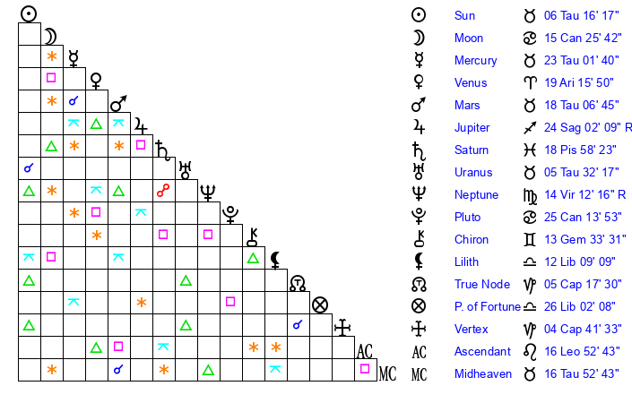 | Sun | 6 Taurus 16 | 6 Taurus 43 | 1 Leo 34 |