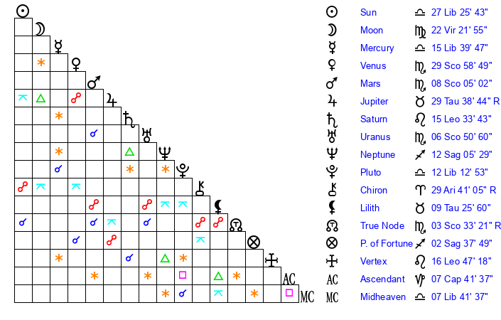 | Moon | 22 Virgo 20 | 18 Libra 34 | 8 Cancer 34 |