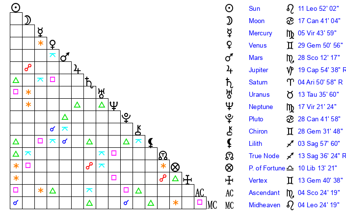 | Sun | 11 Leo 52 | 12 Leo 34 | 7 Scorpio 51 |